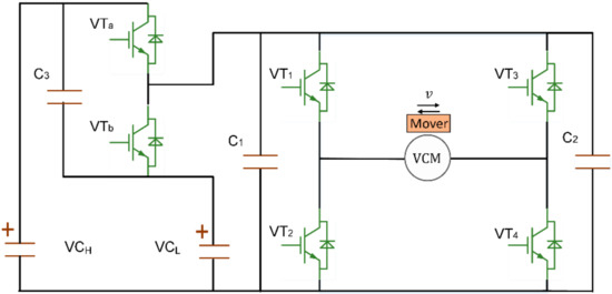 A single-phase H-bridge circuit is developed to adjust the armature current of the LEM based on the control strategy described above. As shown in Figure 10, the H-bridge driving circuit consists of two by-pass switching tubes (VTa, VTb), three high-frequency capacitances (C1, C2, C3) and a set of super-capacitors (VCH, VCL). There are four insulated gate bipolar translators IGBTs (VT1, VT2, VT3, VT4) in the backbone circuit, which regulate the value and direction of current. The high-frequency capacitance has a function of absorption and protection of switching surge. The switching statuses of IGBTs (VTa, VTb) determine whether the LEM is working on the motoring or generating mode. In order to realize the charging and discharging, the initial state of these two super capacitors VCH and VCL are high and low voltages respectively. In simulation analysis, this H-bridge is verified to be capable of realizing stable operation effectively. Compared with the conventional single-phase H-bridge circuit, it benefits the feedback of electric energy and improves the efficiency of the electrical energy storage.