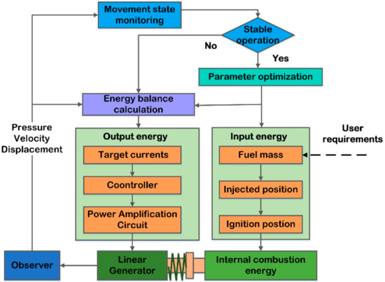 In Figure 11, the input energy is associated with combustion parameters, they are operated according to the introduced working principle. The output energy is adjusted by target current for stable operation in each stroke. The target current is calculated in the energy balance calculation stage. The details of the current control loop of LEM are shown in Figure 12, which is different from Figure 7 on the calculator. In this control strategy, the calculator is designed according to the Equations (22), (27)–(29) with six target current outputs. In this control diagram, the unit of movement state monitoring detects the stages of stroke (compression or expansion stroke) and system stability. Once the stable operation is realized, the parameter optimization is starting. Then, according to the in-cylinder pressure, piston velocity and displacement, the enable positions of electromagnetic valves, injected position and ignition position will be regulated to obtain higher conversion efficiency and lower emissions.
