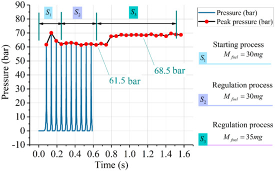 Figure 14 shows in-cylinder pressure from the starting process and when the injected fuel mass changes. The peak pressure increases to a higher value steadily when the fuel mass changes to 35 mg. The smooth control of peak pressure reflects the feasibility of the ladder-like strategy.