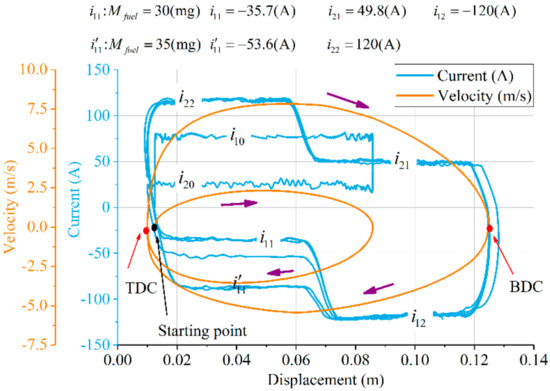Figure 15 shows the changes of the currents under different fuel mass in stable stage. As shown in Figure 6, i10 and i20 are the starting current, which correspond with the displacement from starting point to BDC1 and the displacement from BDC1 to TDC, respectively.