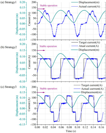 From Figure 16, the actual current changes under strategy 1 are proportional to the velocity of piston. Especially, the starting of expansion stroke, the change of the current is faster than other zones. The starting of compression stroke, the changes of currents under three control strategies are similar. The actual currents of strategy 2 and strategy 3 are following the reference currents, this states the power converter unit is effective to control the LEM armature current.