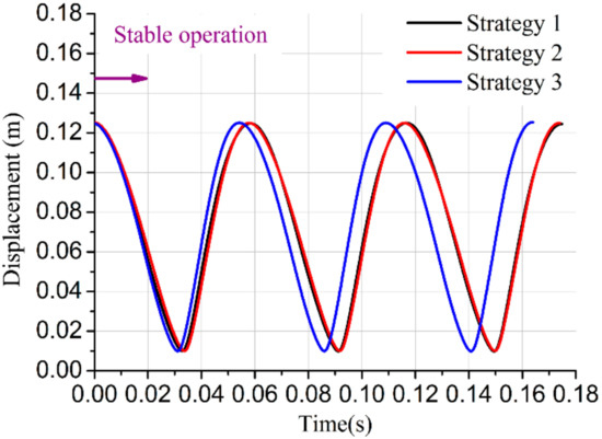 Through analyzing the results above, the strategy 3 has a faster operation frequency when the injected fuel masses are identical. The reduction of electromagnetic force in the acceleration zones and increment of the electromagnetic force in deceleration zones can effectively improve the average velocity of the piston, which contributes to the rapid conversion of energy. Therefore, the average output power of system has a promotion with ladder-like electromagnetic force. Meanwhile, the results are also consistent with the Equation (25).