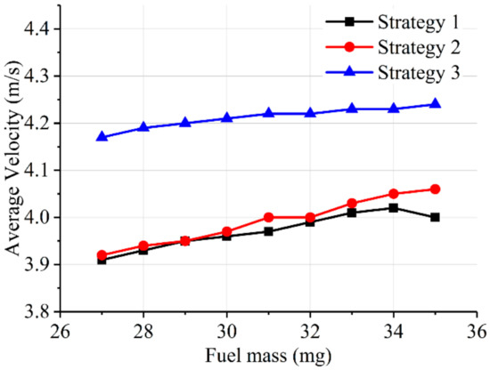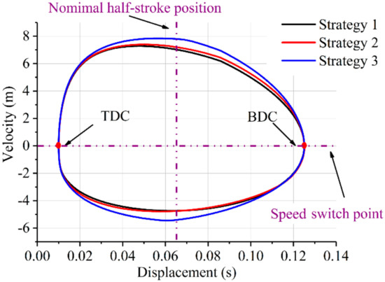 In Figure 17, the displacements of the three control strategies are compared, the initial position and time are unified. This figure shows that the control strategies 1 and 2 almost have no difference on the duration of one cycle, but that of the control strategy 3 is shorter. This illustrates that the piston has a higher average velocity under our ladder-like control strategy. The phase trajectories of three control strategies are compared in Figure 18. The piston velocities of expansion and compression stroke have an increment under strategy 3. In addition, the average velocity of the piston is simulated under different fuel mass. The change range of fuel mass is increasing from 27 to 35 mg by 1 mg each time. In Figure 19, the blue curve is the result of the average velocity using the ladder-like strategy, the average velocity is significantly higher than with the other control strategies. At the same time, the velocity of strategies 1, 2 and 3 is increasing along with the increasing fuel mass, respectively.