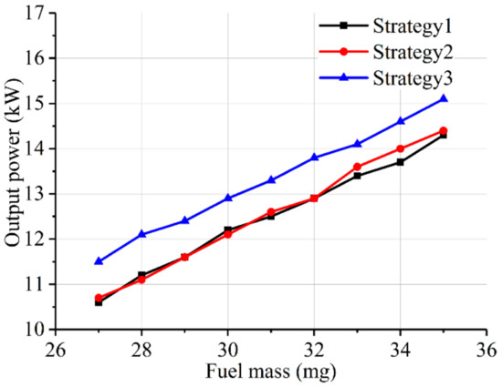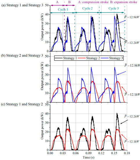 In Figure 20, the instantaneous power of three control strategies are compared. The results are obtained when the fuel mass is specified to be 30 mg. In Figure 20a, the average power of strategy 1 is 12.2 kW, which is less than the average power of the strategy 3, 12.9 kW, although their peak values are similar. It is because the average velocity of strategy 3 is higher as shown in Figure 19. In Figure 20b, the strategy 3 has larger amplitude and average power than strategy 2. In Figure 20c, there is no significant difference on average power, though the strategy 1 has larger peak values than strategy 2.