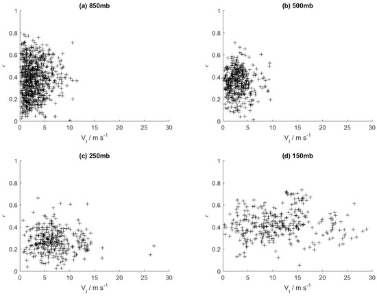 Scatters of ε vs. Vt for four of the eleven standard pressure levels: (a) 850 mb; (b) 500 mb; (c) 250 mb; (d) 150 mb.
