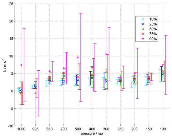 In Figure 6, the point estimates for the coefficient L are positive at all pressure levels except 1000 mb and 925 mb. Even at these two levels, the confidence intervals obtained do not exclude the possibility of L being positive. Two further features were observed based on an impressionistic observation of the plot that also takes into account the error bars. First, the value of L at each pressure level appears to increase with higher percentiles.