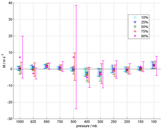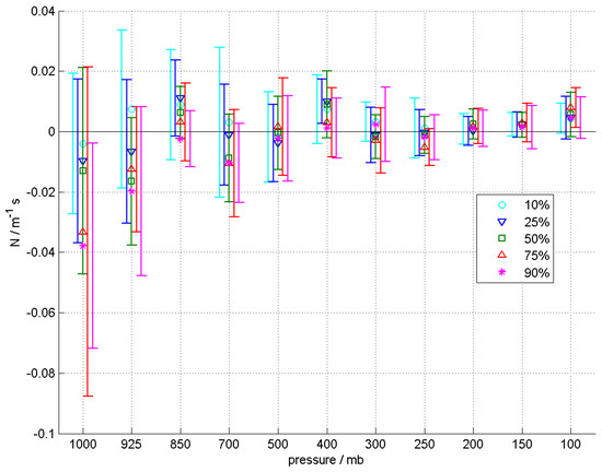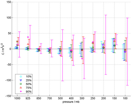 The results for the fitting coefficients L, M, N, C, D, E, A, and B are plotted in Figure 6, Figure 7, Figure 8, Figure 9, Figure 10, Figure 11, Figure 12 and Figure 13. As separate scatters were created for each individual pressure level, vertical profiles of the fitting coefficients could be obtained and plotted for each of the percentiles considered. In the plots, the pressure level is plotted on the horizontal axis from a lower level to a higher level while the value of the respective fitting coefficient is plotted on the vertical axis. The results obtained for the different percentiles are represented by markers of different colours. On top of the point-estimated values obtained from the regression analysis, the 98% confidence intervals for each estimate are also given as denoted by the co-located error bars.