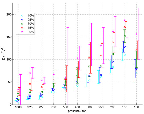 The characteristics of σ2t is, in contrast, quite the opposite. The coefficient M taking zero value implies that the trace of the variance does not depend on the magnitude of the mean wind. Also, the coefficient D shows a clear vertical profile in Figure 9 that indicates dependence on the pressure level. Since M = 0, D, rather than only being an intercept value, can be regarded as indicative of the value of σ2t at each percentile regardless of Vt. The vertical profile of D observed is such that it implies the standard deviation (the size of the ellipse in Figure 1) grows larger with height until near the tropopause level. This trend could easily be mistaken for an increasing trend with the wind magnitude as the magnitude of the mean wind velocity too increases with height. However, the scatter analysis showed that the dependency is on the pressure level and not the wind velocity.