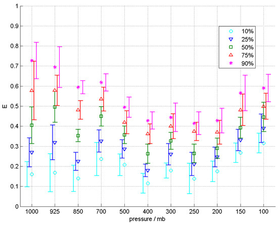 Results and vertical profile for the coefficient E at the five percentiles: 10%, 25%, 50%, 75%, and 90%. The error bars shown are for the 98% confidence interval.