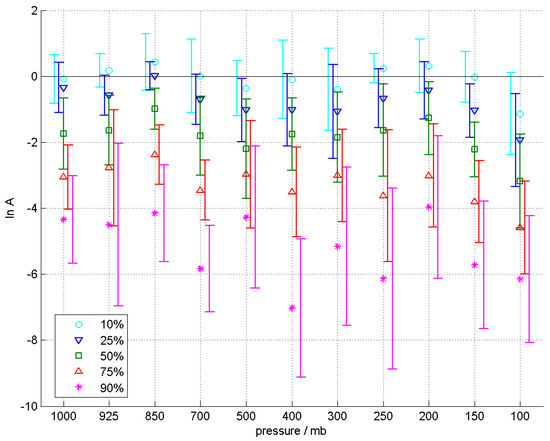 Results and vertical profile for ln A at the five percentiles: 10%, 25%, 50%, 75%, and 90%. The error bars shown are for the 98% confidence interval.