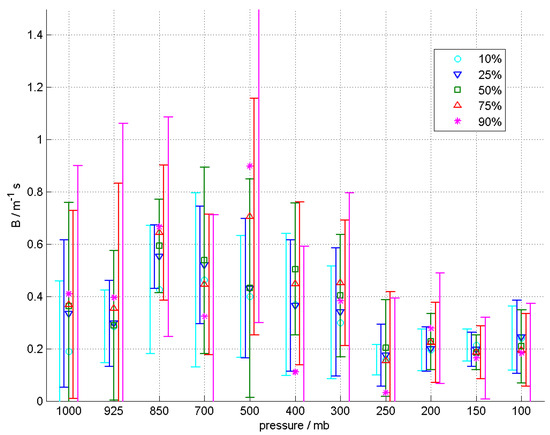 Results and vertical profile for the coefficient B at the five percentiles: 10%, 25%, 50%, 75%, and 90%. The error bars shown are for the 98% confidence interval. Where applicable, the error bars are truncated at B = 0 as B is defined to be positive.