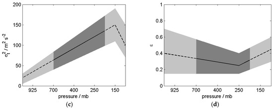 Qualitative illustrations of the observed trends summarised in Table 4. The black lines represent the median value whereas the shaded grey areas depict the spread. In (c,d), the areas of darker shade with the solid median line represent the mid-troposphere between the 700 mb and 200 mb pressure levels where the results in Table 4 were shown to be valid. (a) σ2s vs. Vs; (b) η vs. Vt; (c) σ2t vs. pressure level; (d) ε vs. pressure level.