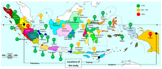 By the end of 2015, the overall electrification ratio (ER) in Indonesia was 86%, which ranged from the lowest value of 36% in Papua, a moderate value around 65% in some provinces on the islands of Sulawesi, Kalimantan, and Timor, to the highest value of 98% in Jakarta [2] (Figure 1). Electrification ratios in two other provinces selected in this study, the Province of Riau and the Province of East Nusa Tenggara (ENT), were 71.5% and 52.3%, respectively. These significant disparities in the ERs of the three provinces do not represent many differences of the absolute number of households without electricity. Approximately 530,000 households without electricity could be found in ENT, 470,000 in Papua, and 435,000 in Riau.