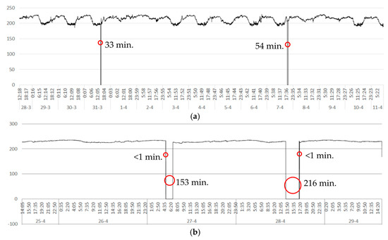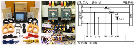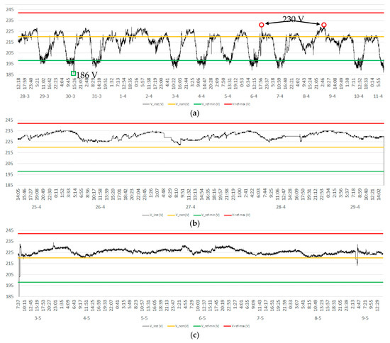 For power measurements, a 3169-21 Clamp-On Power HiTester (Hioki, Nagano, Japan) was installed on three-phase main distribution panels at office buildings in urban areas of the three locations. The Hioki device measured many power quality parameters, including the voltage level, with a recording interval of 1 min. The accuracy of the voltage level measurement is ±2%.