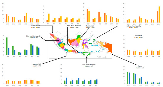 For further illustration, in Figure 3, the SAIDI and SAIFI are shown in small graphs for the eight regions of Sumatra, WNT, Kalimantan, Sulawesi and Maluku, Java and Bali, ENT, Papua, and the “Riau and Riau Islands”. As shown, from 2010 to 2015, the SAIDI slightly decreased in Sumatra and Kalimantan, whereas in Papua, they decreased rapidly. Conversely, the SAIDI in Java and Bali as well as for the whole of Indonesia only changed slightly during this period, whereas in Sulawesi and Maluku a significant increase of SAIDI took place in 2015. It can be concluded that outside the islands of Java and Bali, the SAIDI and SAIFI can vary strongly depending on the location and the year of reporting because in Indonesia the majority of the power production capacity is located on Java and Bali (see Section 2.1).