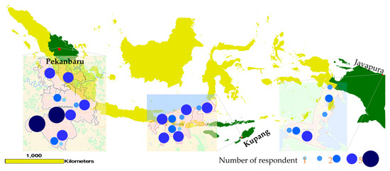 The demographics of the respondents are outlined in Appendix A (Table A1), and the distribution of respondents by city address is shown in Figure 4. Most of the respondents in Pekanbaru and Jayapura were upper-middle-income households, but in Kupang, they originated from lower-middle income groups. A significant number of high-income households also participated in Pekanbaru (respondents are classified into four groups of income based on the World Bank criteria (2016); for 2016, low-income economies are defined as those with gross national income (GNI) per capita of $85 or less in 2015, lower middle-income between $86 and $335, upper middle-income between $336 and $1040, and high-income economies are those with a GNI per capita of > $1040 or more).
