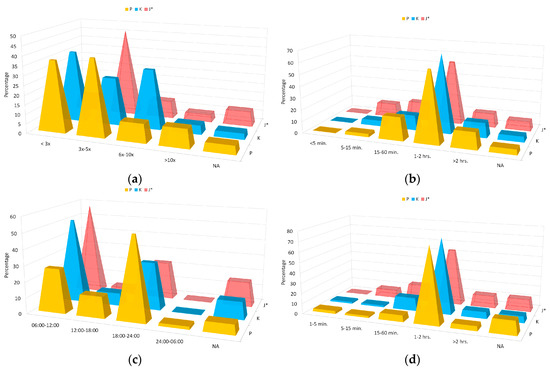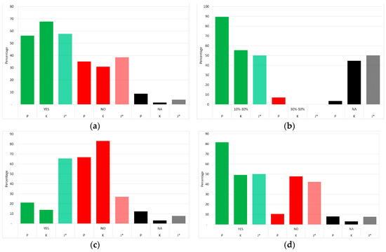 The proportion of respondents’ answers to survey questions in percentages: (a) Would you accept an increase in your electricity bill for better electricity service? (b) How much increase in your electricity bill would you find acceptable? (c) Do you have a backup generator at home? (d) Do you experience stable electricity voltage at home? P: Pekanbaru, K: Kupang, J: Jayapura *, NA: No answer. * Data from Jayapura is less representative.