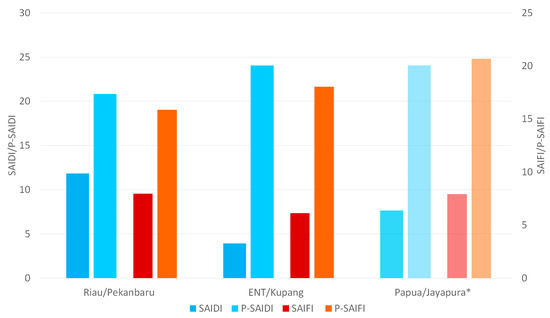 Table 2 and Figure 3 show the SAIDI and SAIFI at various locations in Indonesia based on averaged historical data from 2010 to 2015 in the Statistic PLN [2,48,49,50,51,52]. Regarding SAIDI, as shown in Table 2, each customer in Riau experienced 11.8 h of outage per year or around 59 min per month. In Papua and ENT, each customer experienced shorter outage durations of 38 and 17 min/month, respectively, during the same period. Regarding the SAIFI, customers in Riau and Papua experienced outages more often (7.9 events per year) compared to those in ENT (6.1 events per year).