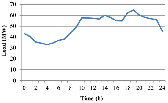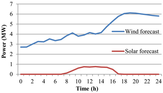 The fuel oil used by conventional generation has a cost of 0.847 ($/L) [47] and has a reserve rate of . The estimated profiles of load, wind power [48], and photovoltaic power [49] were taken as the expected data, and are shown in Figure 2 and Figure 3, respectively.