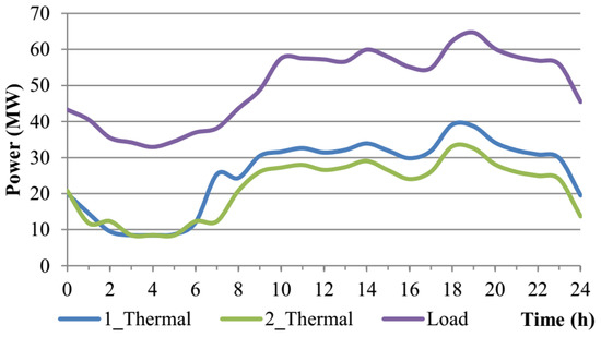 By analyzing the scheduled results, it is possible to observe that the geothermal and hydro units form the basis of the load diagram, being committed in the whole day. When wind and solar energy production are included, these are used whenever possible, and deliver the maximum of renewable production to the system. The thermal units serve to satisfy the complementary requirements of the system, as shown in Figure 4, where the different profiles of thermal production on a winter’s day are shown; these are very similar to the profile of the load for the same period.
