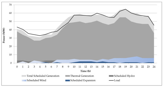 Figure 6 shows how all types of generation are scheduled during the day. It is possible to analyze the influence of the variability and uncertainty of renewable generation, which may be reduced, for instance, by considering the flexibility of the energy storage system.