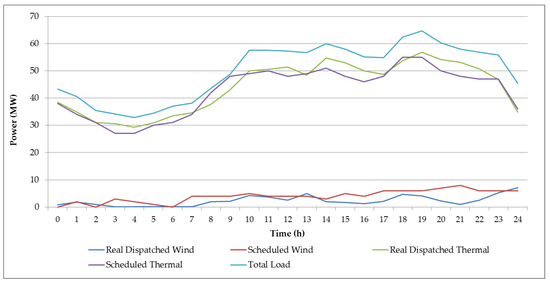 Finally, Figure 7 shows the benefits of the model against the results reported by the ES operator on the same day. It is thus possible to observe that the proposed model propose more wind generation (the scheduling process), in opposition with the real wind dispatched (from ES operator point-of-view), which reflects conventional thermal generation reduction.