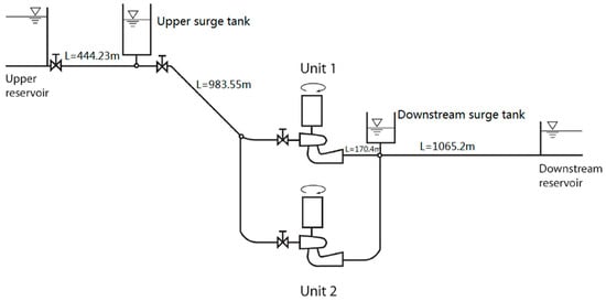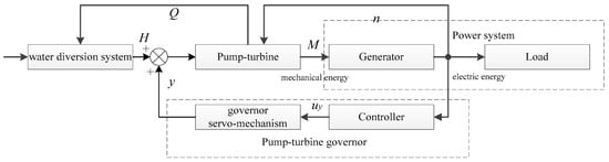 The pump-turbine governing system (PTGS) is a main control system that undertakes the modulation of frequency (rotational speed) and power output. The simulation of PSU start-up is also related to PTGS. PTGS is composed of governor controller, governor servo-mechanism, water diversion system, pump-turbine and generator, as presented in Figure 1. In this paper, a method of characteristic (MOC) and an improved Suter transformation method have been studied for the modelling and simulation of PTGS [30,31].