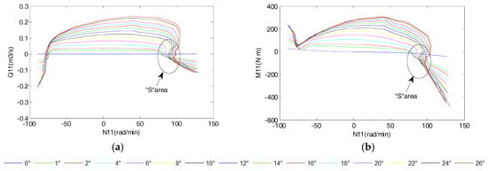 By setting the unit parameters N11~Q11 and N11~M11 as a cross-ordinate, a series of two-dimensional curves could be built to describe the complete characteristics of a pump turbine. While setting the gate opening y as reference variable, the flow characteristic curves and the torque characteristic curves of the complete characteristics could be established for a pump-turbine, as shown in Figure 3. In this figure, the range of guide vane opening is from 0° to 26°. From Figure 3, it can be noticed that the “S” area exists in characteristic curves. A multiple-valued problem occurs in interpolation calculating for pump-turbine modeling. In order to overcome this obstacle, an improved Suter transformation is used, as follows [36]: