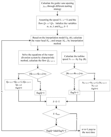While simulating the PTGS, the coupling relationships of water diversion system, pump-turbine and generator should be considered. Thus the iterative computation to calculate the water flow Qn+1 and turbine speed Nn+1 of the next time n + 1 for the simulation of PTGS before switching PID regulation is adopted, as the flow chart shown in Figure 6.