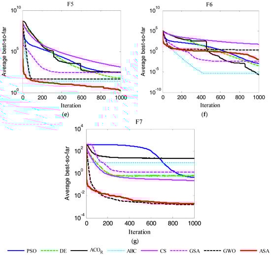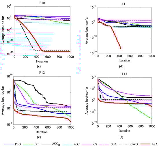 To evaluate the performance of the proposed ASA, as well as other seven meta-heuristic optimization algorithms, i.e., Particle Swarm Optimization (PSO) [25], Differential Evolution (DE) [39], Ant Colony Optimization for continuous domain (ACOR) [40], Artificial Bee Colony (ABC) [41], Cuckoo Search (CS) [42], Gravitational Search Algorithm (GSA) [27], and Grey Wolf Optimizer (GWO) [43], were applied to solve 13 standard benchmark functions. The selected algorithms are representatives of evolutionary, physics-based and SI based meta-heuristics. In these algorithms, the newly developed meta-heuristics are included. The following experiments are conducted on MATLAB (R2016a, MathWorks, Natick, MA, USA).