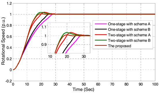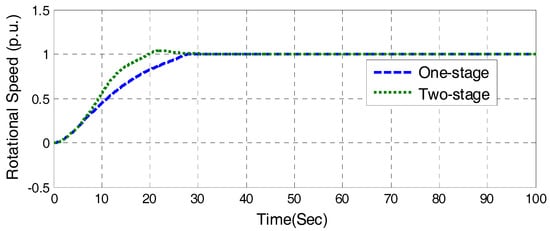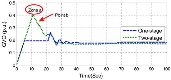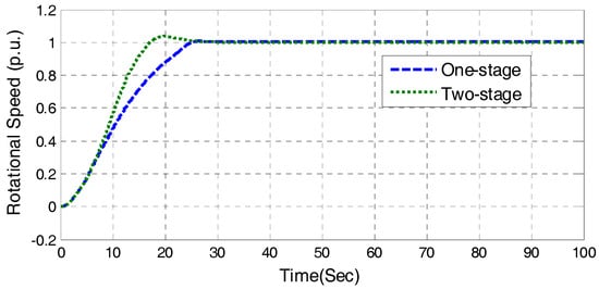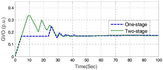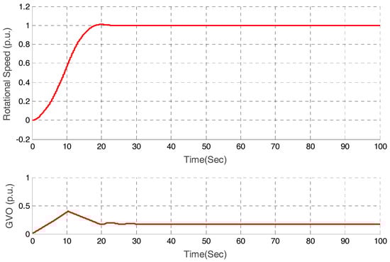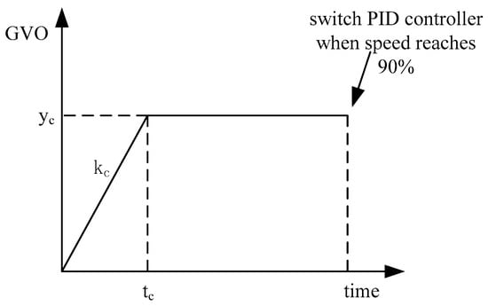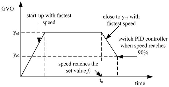 PSU start-up usually refers to the process of unit starting in turbine mode. This process begins at the time the guide vane is beginning to move and ends at the time the unit connects to the grid. PSU start-up is a complex control problem. Multiple control models exist in start-up processes. The traditional and actually applied start-up strategy of PSUs mainly contains two phases [15], namely the open-loop type and the close-loop type [16]. In the first phase, a direct guide vane control (DGVC) is adopted, which is usually open-loop, while the governor drives the guide vane (GV) as a given law. In the second phase, a closed-loop PID control is applied to track the rated rational speed and maintain the stability. The open-loop DGVC law provides the trajectory of guide vane opening (GVO), which could be a one-stage polyline or two-stage polyline. Take the two-stage DGVC as an example, in a two-stage strategy, the guide vane will firstly open to start opening, which is about twice as much as the no-load opening, and then keep the opening for a while; until the rotational speed rises to a threshold, guide vane opening is adjusted to the no-load opening. In the second phase, a closed-loop PID control is switched in to stabilize the rotational speed as soon as it reaches a threshold value.