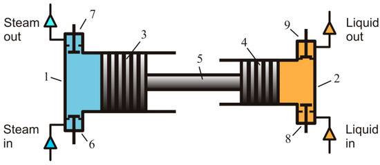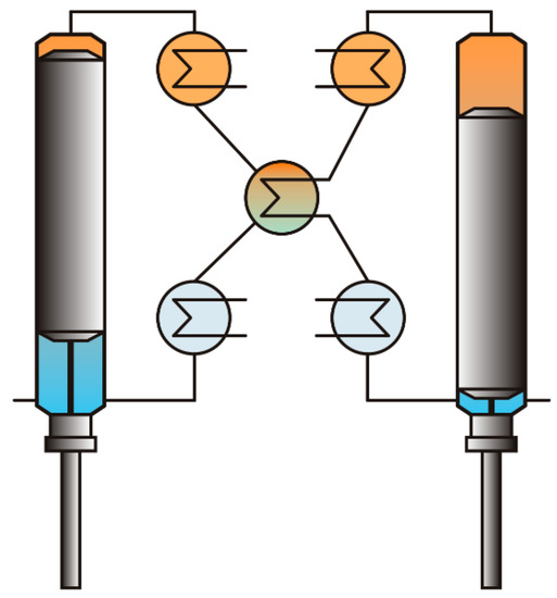 As in the case of gaseous working fluids, it is also possible to realise self-oscillating piston designs for machines with dense working fluids [28,29,30,31]. A functional scheme of one of such self-driven machines is shown in Figure 4.