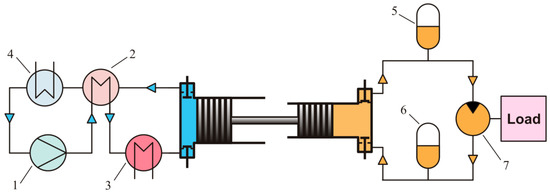 A conceptual sketch of a thermo-compressor-based power unit is shown in Figure 3. The converter consists of cylinder 1 filled with gas, with well-sealed piston 2 inside, so that the piston subdivides the internal volume of the cylinder into two—hot and cold—parts shown in rose and blue colours, correspondingly. Both parts are communicated through heater 3, regenerator 4 and cooler 5 connected in series. The regenerator plays here the same role as the recuperator of the direct acting pump shown in Figure 2. The piston can be set in reciprocating motion by means of sealed rod 6 and linear actuator 7.