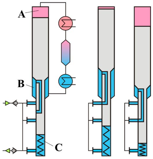 Scheme of Bush-type self-driven machine; A—hot part, B and C—cold parts with the displacer in intermediate (left) and two extreme positions.