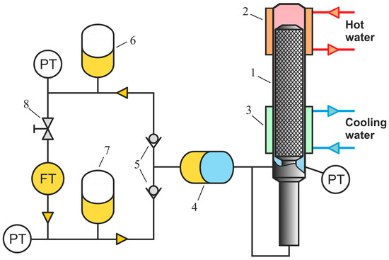 Scheme of the experimental setup. 1—IE engine, 2—heating jacket, 3—cooling jacket, 4—diaphragm unit, 5—non-return valves, 6—high-pressure accumulator, 7—low-pressure accumulator, 8—throttle valve, PT—pressure transmitters, FT—flow transmitter.