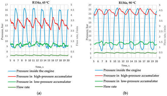Examples of pressure change and pumped flow rate in the self-driven Bush-type engine; working fluid: R134a; temperature of the cooler: 25 °C; temperature of the heater: 65 °C (a) and 90 °C (b).
