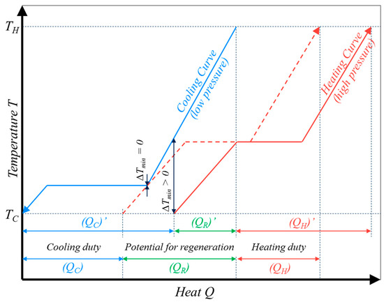 Example of composite curves during isobaric cooling and heating at different pressures; (QC)′, (QR)′ and (QH)′ are shown for the theoretical maximum of regeneration, whereas (QC), (QR) and (QH) correspond to a real situation with the positive minimum temperature difference.