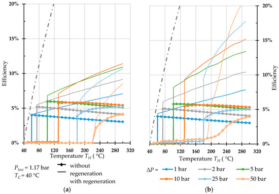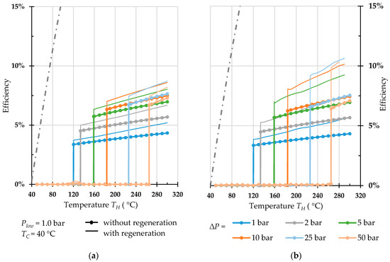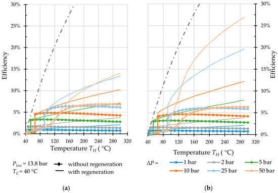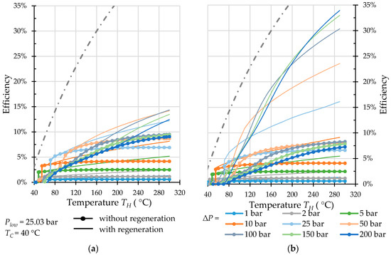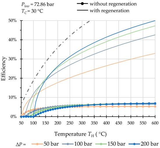The minimum cycle temperature (temperature of the heat sink) was chosen as TC = 40 °C for all the working fluids except carbon dioxide. For carbon dioxide, it was chosen as 30 °C, i.e., below the critical temperature of 30.98 °C in order to guarantee its liquid state at low temperature and any pressure throughout the cycle. The maximum/high cycle temperature was varied from 50 °C to 600 °C for carbon dioxide and from 50 °C to 300 °C for the other working fluids. The low pressure Plow was chosen slightly above the saturation pressure for each fluid at low temperature to exclude undesired boiling at low cycle temperature, but not lower than 1.0 bar, depending on which of the two pressures is higher. The difference between the high and low pressure ∆P was varied in a range of 1.0 to 50 bar. For R32 refrigerant and carbon dioxide, the pressure difference range was extended to 200 bar. Selected results are shown in Figure 8, Figure 9, Figure 10, Figure 11 and Figure 12. Figure 13 shows results for carbon dioxide at very high (up to 600 °C) heat source temperature to estimate a potential of this technology for high-temperature applications. The dash-and-dot line in each graph indicates the Carnot efficiency.