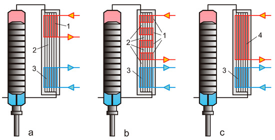 Bush-type engine design for isothermal (a) and non-isothermal heat supply (b,c): 1—heater, 2—regenerator, 3—cooler, 4—regenerative heater.