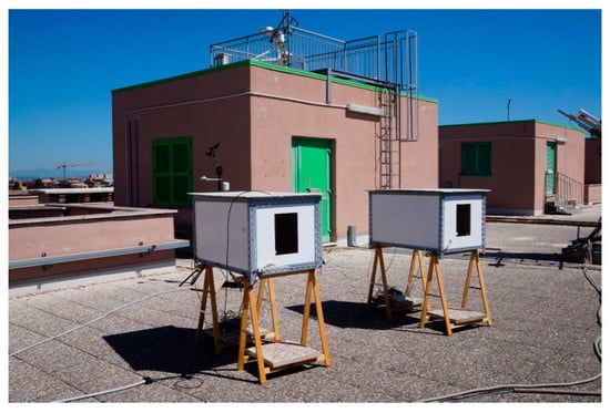 For the calibration phase a short-term monitoring campaign was carried out from 12 to 17 November 2015. The two boxes, one with the old framed (OF) and the other with the new frame (NF) were exposed outdoor as shown in Figure 4. The weather was mostly sunny, with an exception for 14 November, that was mostly cloudy.
