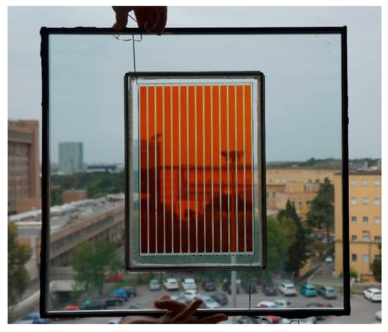 The experimental activity aimed to evaluate the electrical and thermal performance in real operating conditions of the DSC module (DSM) shown in Figure 2. The active area of the module is 20 cm × 30 cm. In order to fit it into the glass pane of the STB, the DSM was inserted into a double glass pane as shown in the figure.