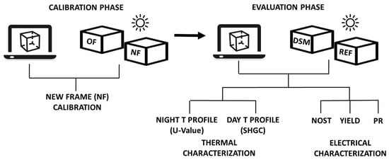 The methodology adopted for this study, schematically shown in the Figure 3 workflow, consists of the combination of experimental data collection from STB and modeling with a dynamic simulation software. The process can be divided in two phases, calibration phase and evaluation phase. The calibration phase is preliminary to the evaluation one. Temperature data collected in one of the boxes, named “Reference” are used to calibrate the dynamic simulation model of STB. In the evaluation phase, the calibrated model allows to evaluate the U-value and SHGC of the material of unknown characteristics located in the second box, named “Test”. In particular, the night temperature profile is used to estimate U, since no contribution of the solar irradiance to the boxes’ thermal loads is present; the daytime temperature profile is used to evaluate SHGC.