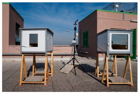 The boxes, shown in Figure 1, were designed with a linear scale factor of 1:5 and a surface scale factor of 1:25 with respect to a real room. They have the dimensions of 1.00 m × 0.60 m × 0.55 m and consist of five opaque walls and one glazed wall. The exterior was manufactured with plywood panels of 8 mm thickness painted entirely white, to make them highly reflective. The entire non-glazed inner surface of the boxes, also comprising the portion of the area behind the frame of the window, was heavily insulated with a lightweight rigid insulating material of 80 mm thickness, Stiferite GT, specific for thermal insulation in buildings. On the south facing wall, a glazed area of 42 cm × 37 cm can be allocated, the remaining of this surface being occupied by a wood frame 90 mm thick, to shield the thickness of the inside insulating panes.