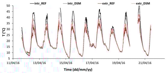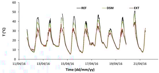 Temperature trends of air temperature inside reference (REF) box and DSM box compared to the external air temperature.