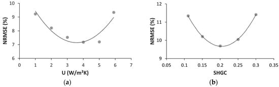 (a) NMRSE versus U-value for the evaluation of U-value of DSM. (b) NMRSE versus SHGC for the evaluation of SHGC of DSM.