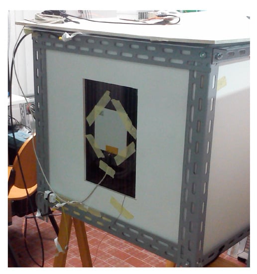 Validation of the U-value outdoor evaluation was carried out using another method in an indoor environment. The measurement was performed on both boxes, REF and TEST in order to check the validity of the method and the U-value of the DSM. A heat flux sensor (Albhorn, mod. MA259035) was applied to REF box which glazed system had known thermal properties (U-value of the glass, Ug = 2.8 W/m2·K) to verify the capability of the method. Two temperature sensors provided by the heat flux measurement kit where attached to the inside and outside surface of the glass. A laboratory hotplate with controlled temperature was inserted into the box. In this way, a temperature difference was created between the inside of the box and the outside laboratory. Temperature and heat flux data were acquired for three hours at a time rate of 30 s, till the steady state was reached. U-value of the glass was calculated averaging the data referred to the steady state. According to EN673 [], the Ug was calculated considering the standard global heat transfer coefficients for the inside and outside. Using this method, Ug = 2.77 ± 0.03 W/m2·K which perfectly fits the results obtained with the outdoor method. The same procedure was then repeated using the DSM box (Figure 10). The U-value obtained for DSM is UDSM = 3.68 ± 0.02 W/m2·K confirming what obtained with the outdoor method.