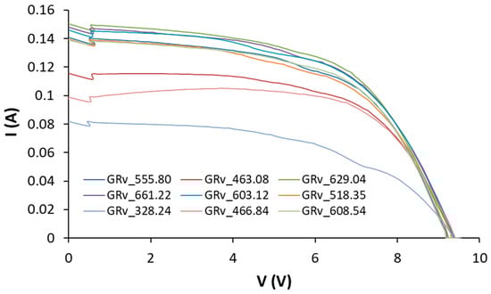 According to the electrical specifications provided by the manufacturers, the DSC module exhibits the nominal characteristics listed in Table 2 with a nominal power declared by the manufacturer, P = 1.47 W. The electrical characterization consisted of the evaluation of the nominal operative system temperature (NOST), the calculation of the temperature coefficients and the evaluation of the energy performance during the period of the test. The I–V characteristic curve visualizes the operating voltage and electricity values of the module. Figure 11 shows the I–V curves, one per day, from 12 April till 20 April, collected in the central part of the day, when the module experienced its maximum production. As expected, the maximum current is increasing with global irradiance while the voltage, which mainly depends on temperature and poorly on irradiance, remains almost constant.