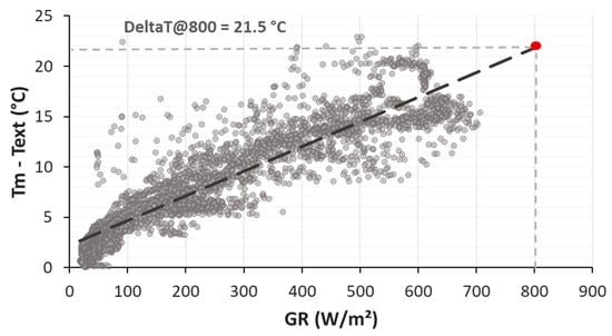 Rating the NOST of the module is helpful to help expect future decay of the photovoltaic conversion. NOST can be seen as the optimal operation temperature of the module. It is defined according to the nominal operating cell temperature (NOCT) []: NOCT is defined for an open-rack mounted module in the following standard reference environment: –tilt angle: 45° from the horizontal; –total irradiance: 800 W/m2; –ambient temperature: 20 °C; –wind speed: 1 m/s; –no electrical load: open circuit. NOST differs from NOCT only because it is evaluated when the module circuit is closed on an electrical load []. NOCT and NOST can be used by the system designer as a guide to the temperature at which a module will operate in the field, and it is therefore, a useful parameter when comparing the performance of different module designs. However, these indexes are directly dependent on the mounting structure, irradiance, wind speed, ambient temperature, reflections and emissions from the ground and nearby objects, etc. In the present case, the same procedure indicated in [] was used, however, the mounting configuration substantially differs from the one prescribed in the norm. For this reason, the value obtained is not compliant with the norm but can give a good indication of the operation temperature of the module. The method consists of the measurement of the temperature difference between the DSM inner surface (Tm) and the outside air temperature. This value is graphed versus the plane of the module irradiance, as shown in Figure 12. A linear interpolation of the data allows evaluating the temperature difference at the irradiance value of 800 W/m2. The NOST value is calculated from this temperature difference considering an outside air temperature of 20 °C. The value obtained is T(NOST) = 41.5 °C. For standard crystalline PV modules NOCT usually ranges between 40 °C and 50 °C (typically 45 °C). NOST values can be lower than NOCT [].