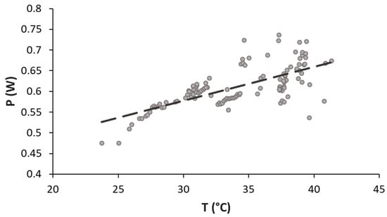 Figure 13 reports the trend of P, with varying module temperature. The figure shows a positive trend of power with increasing temperature showing a positive temperature coefficient of 0.0082 W/°C (the angular coefficient of the interpolant). This means that PV production increases as temperature increases making DSM suitable for integration in buildings where the modules usually suffer from high temperatures and cannot be efficiently cooled.
