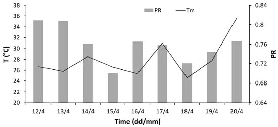 The overall energy produced by the module operating during the monitoring campaign is 32.05 Wh. The average PR for the total time period considered is 0.76. Average efficiency over the period of test is 2.49%, to be compared with ηSTC = 3.28%. The average efficiency during the central part of the day reached 3%. Figure 14 reports the daily PR together with the average diurnal temperature of the back of the module. The daily PR is fluctuating day by day and this behavior does not seem to be related to temperature variations (see Figure 14) but rather to instabilities of the module or to the method used for the measurements. For example, on 15 April, although the day presented the highest solar irradiance, DSM gave the lowest performance and efficiency (see also Table 3). Further investigations are necessary to deepen this aspect.